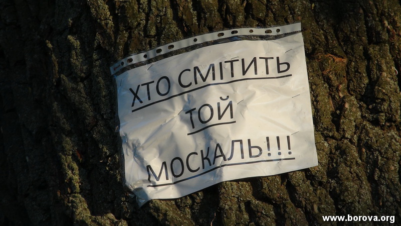 Какой то умник по своему скудоумию,ну или вернее от "большого ума" поцепил на дамбе Таманского ставка,это в с.Червоная Мотовиловка,Киевской области, вот этот перл ...а другой такой же, не меньший, по видимому умник, это выставил еще и на местном поселковом сайте....ну мотивы конечно же знакомые....даже тут рука Москвы взяла и намусорила....вона ж и майдан загадила ....а мы ж выще всего этого...древние бо укры мы.....